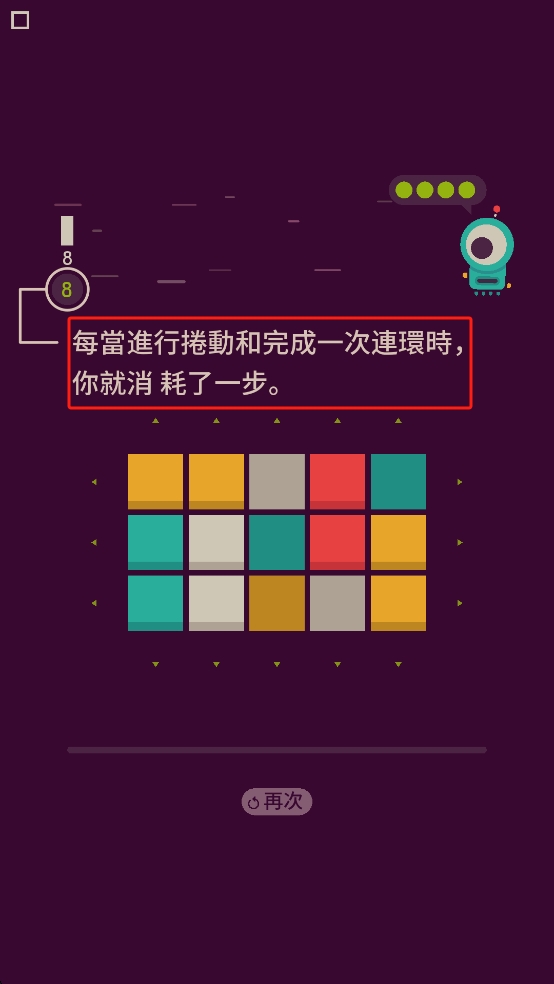 3、理解屏幕上方的规则,规划彩色的方块捲动路径,在8步内完成连环,消除同色的方块推进关卡。