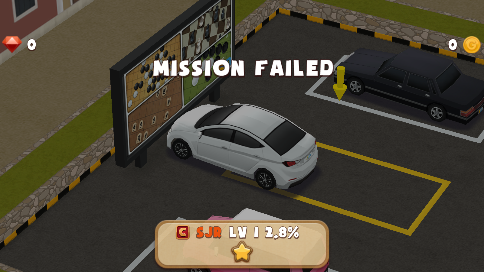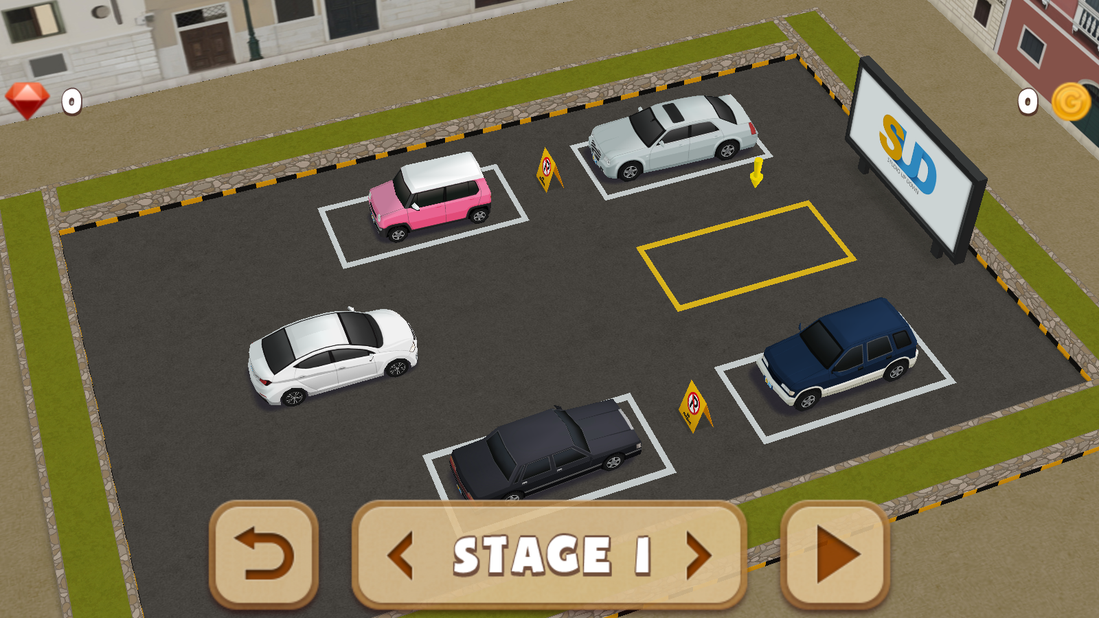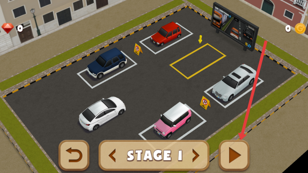 2、在关卡选择界面,点击右侧箭头按钮,进入STAGE-1的停车场场景,开始停车任务。