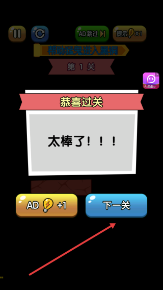3、成功通关后,点击下一关继续挑战,利用提示功能解决难题,或看广告获额外能力,推进关卡。