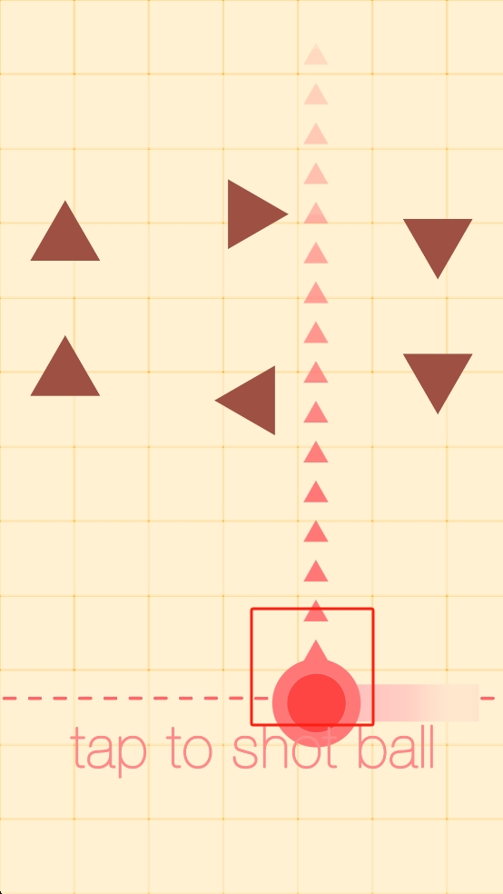 1、观察上方粉色三角形轨迹,点击红色发射球,让小球沿轨迹射出,注意避开棕色三角形障碍。