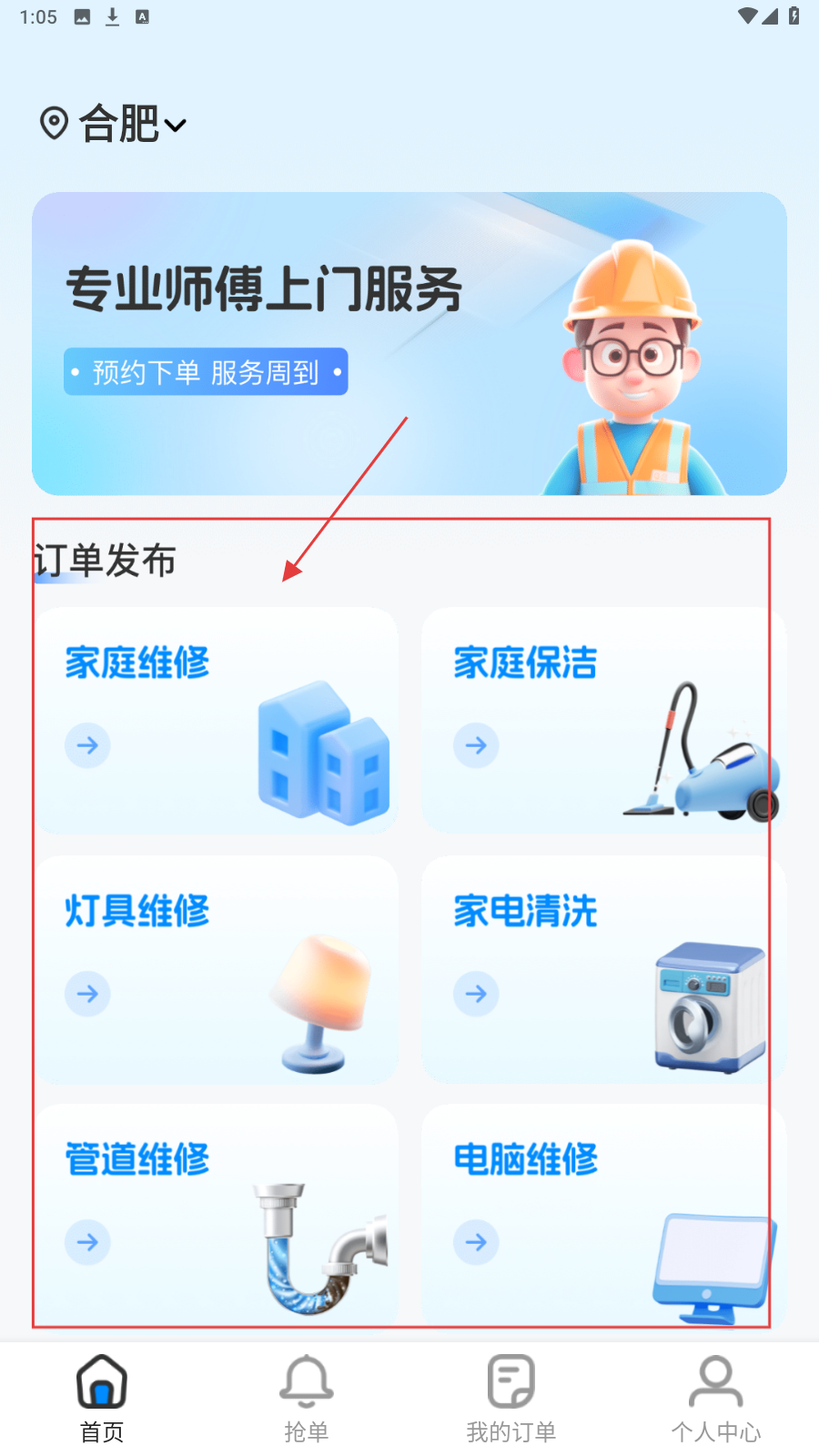 1、打开应用,在【订单发布】选对应维修类型,如家电清洗等,进入下单流程。