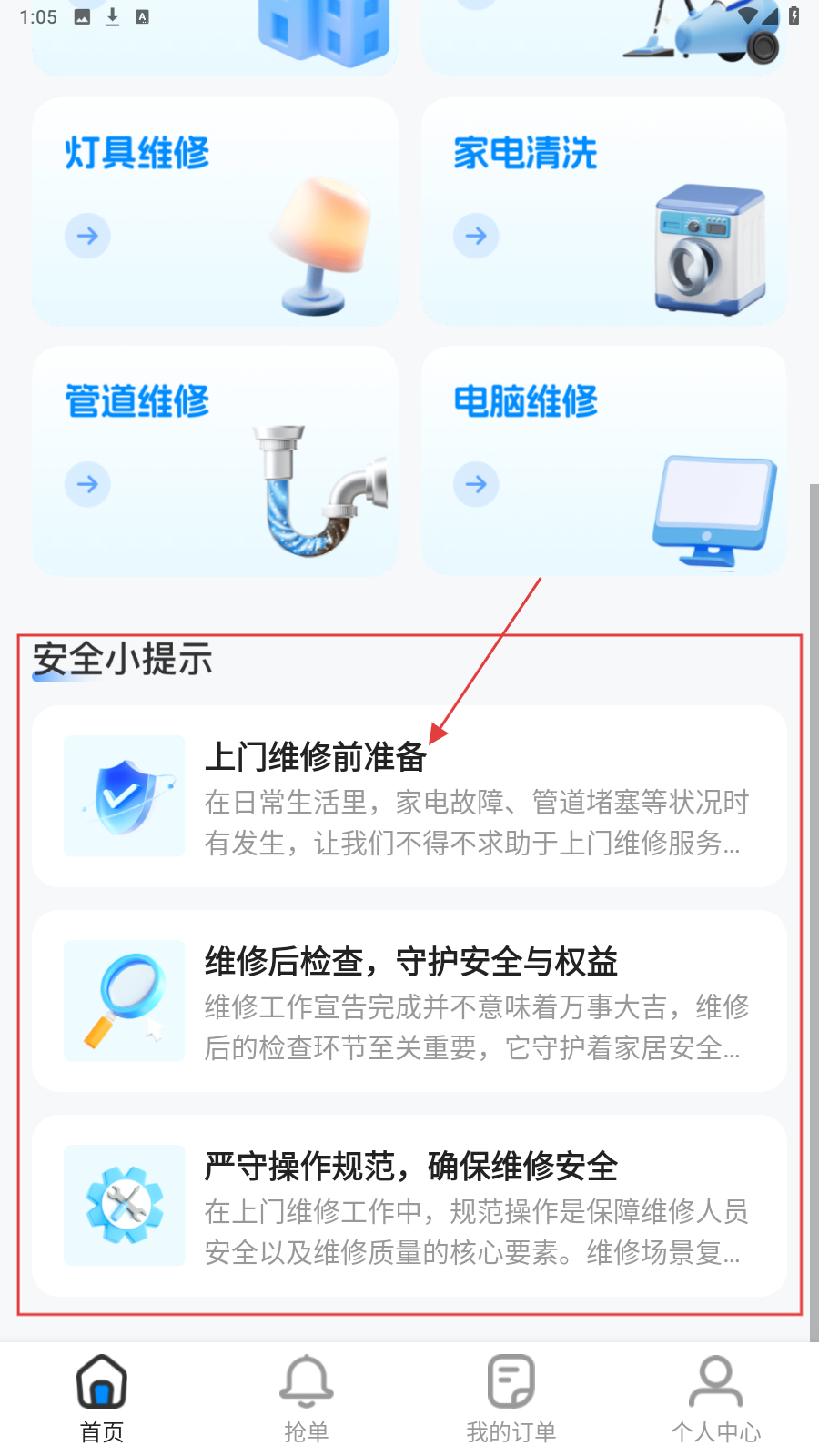 3、下单前看【安全小提示】,了解上门维修前准备、维修后检查等注意事项。