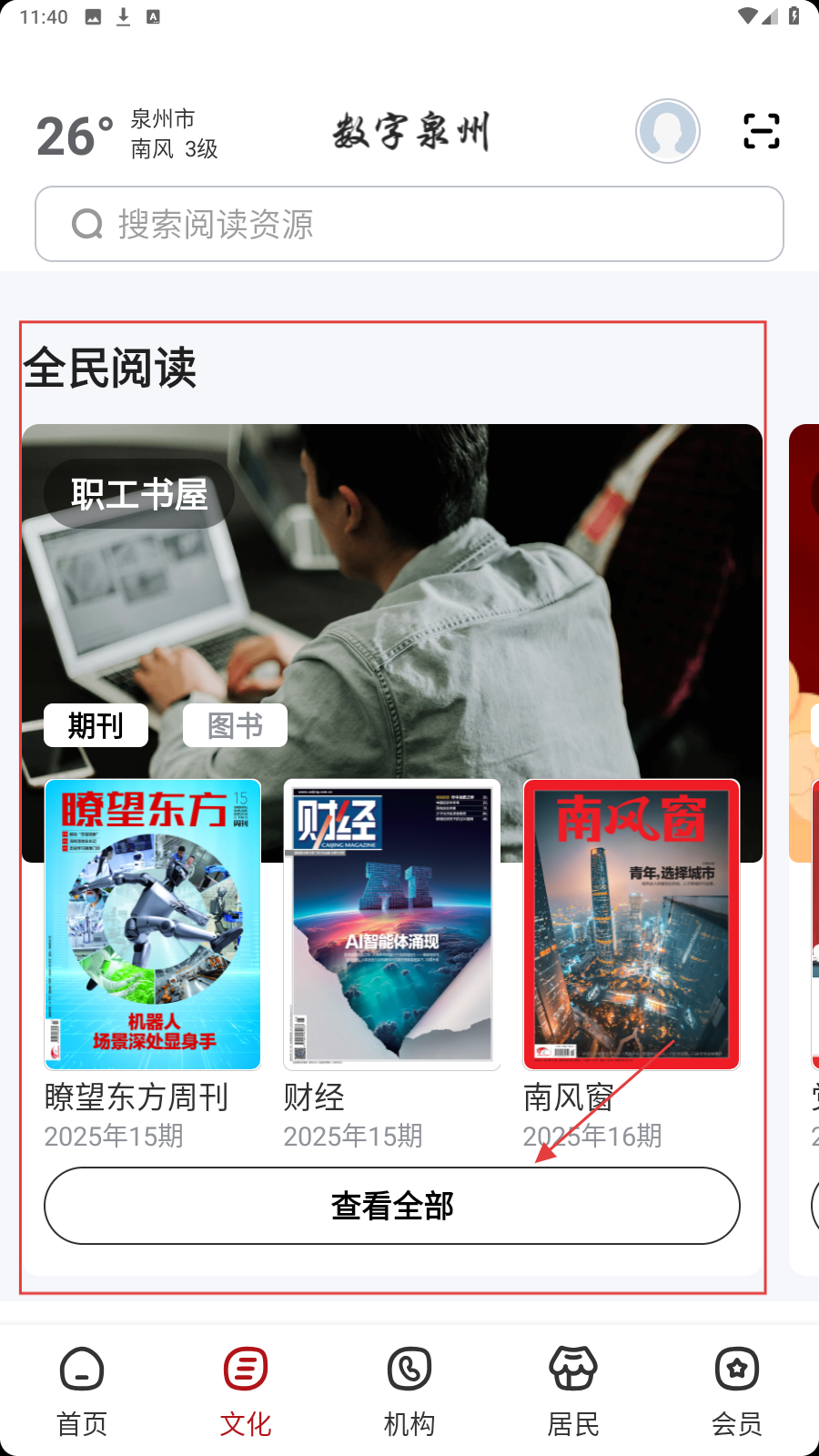 1、进入【数字泉州-文化】页,在【全民阅读】区点【查看全部】,可浏览更多期刊图书资源。