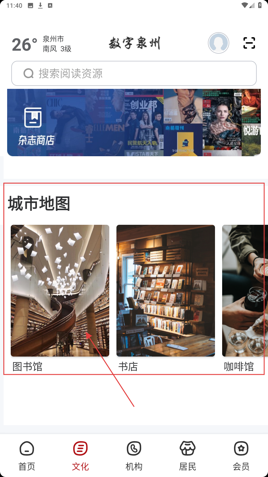 2、在【文化】页找【城市地图】,点【图书馆】图标,进入场馆选择界面。