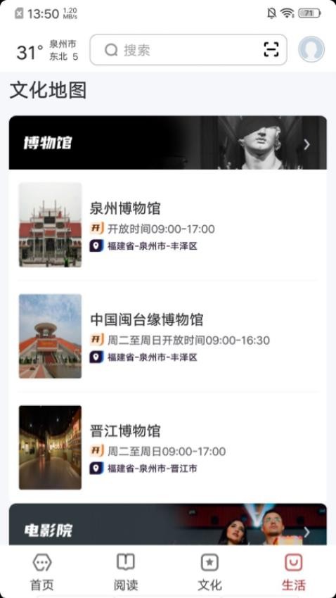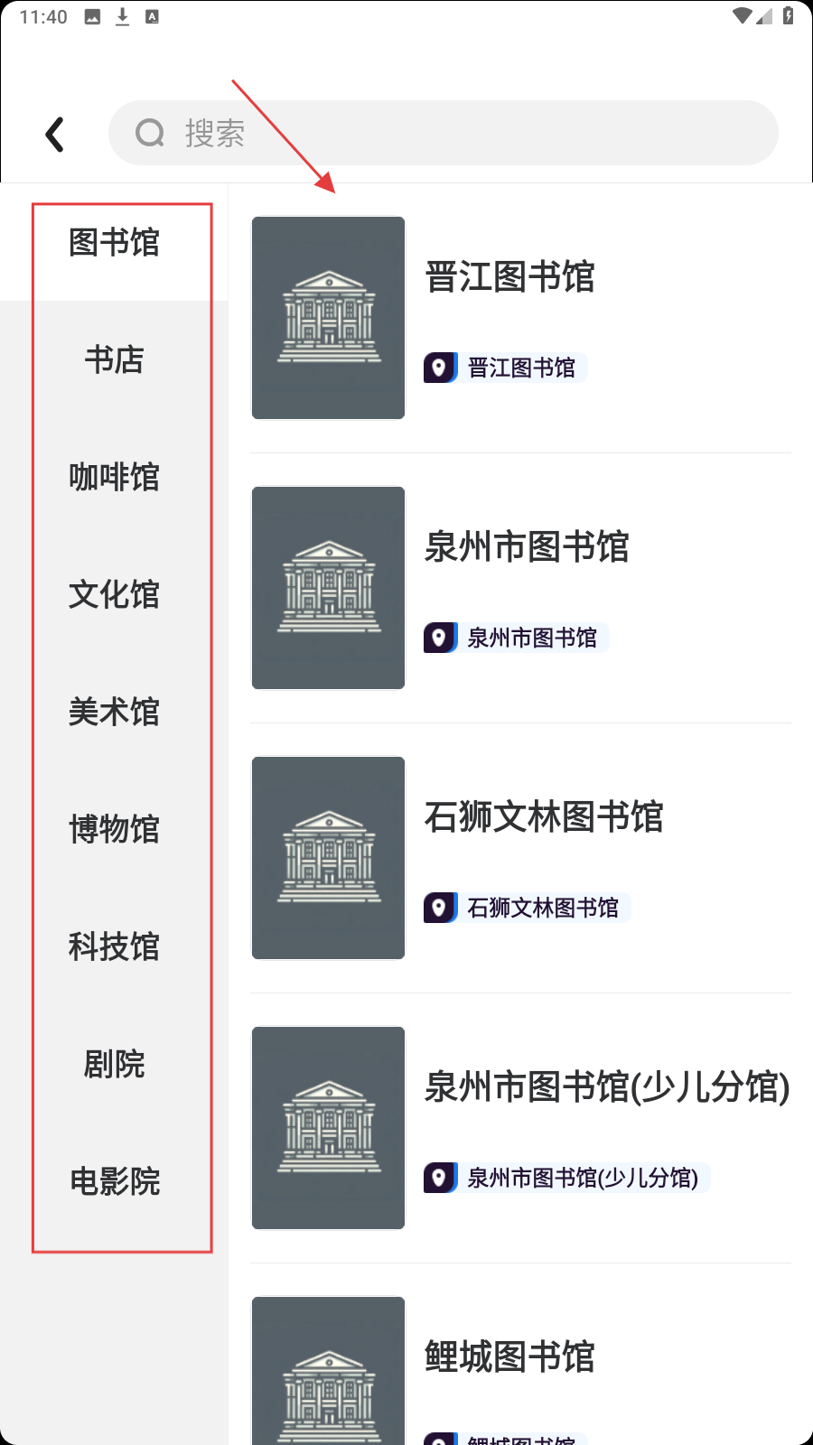 3、选【图书馆】分类后,列表展示晋江图书馆、泉州市图书馆等,按需点击进入详情。