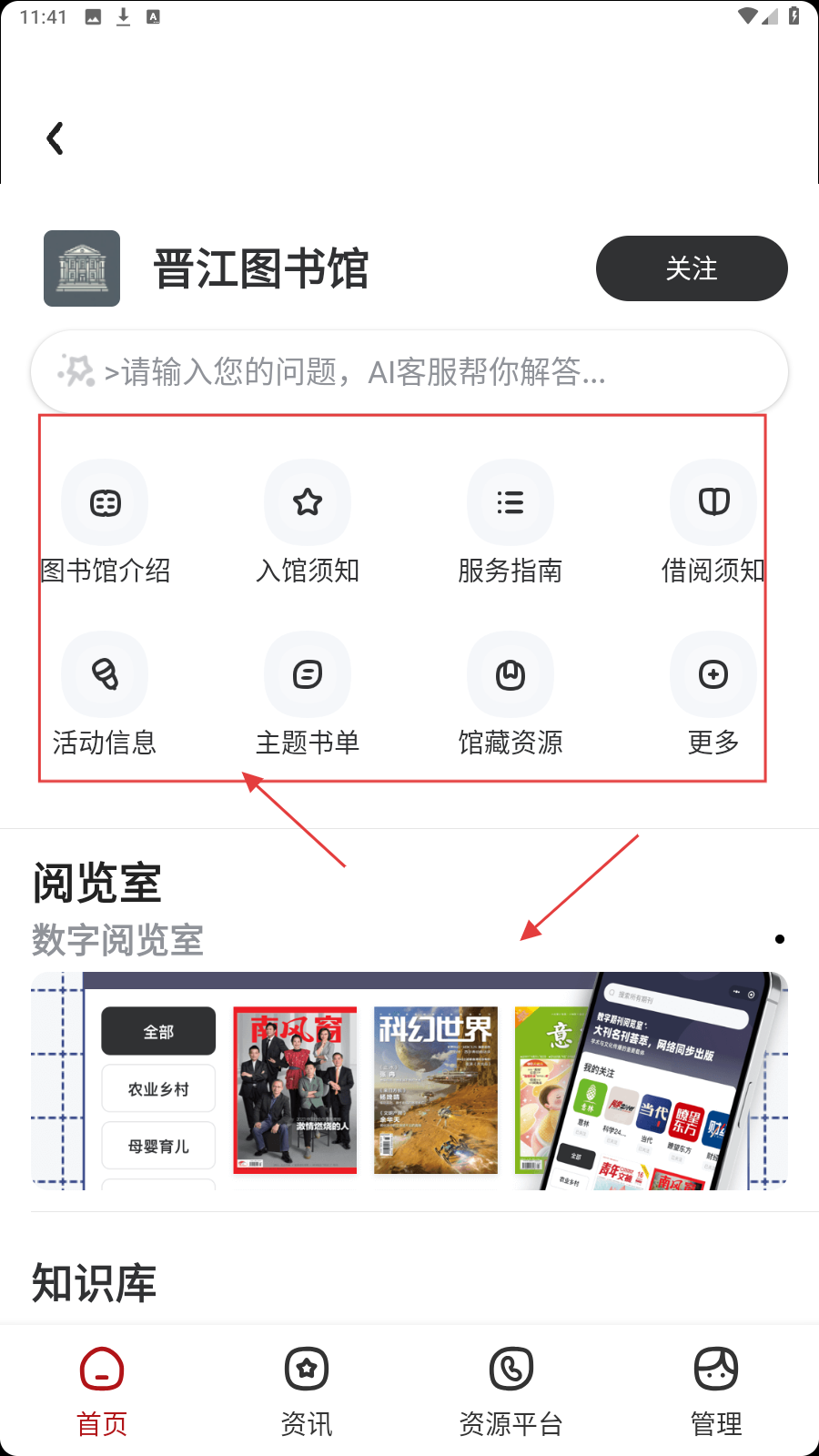 4、进入【晋江图书馆】页,点【主题书单】,可查看特色书单,还能逛数字阅览室找资源。