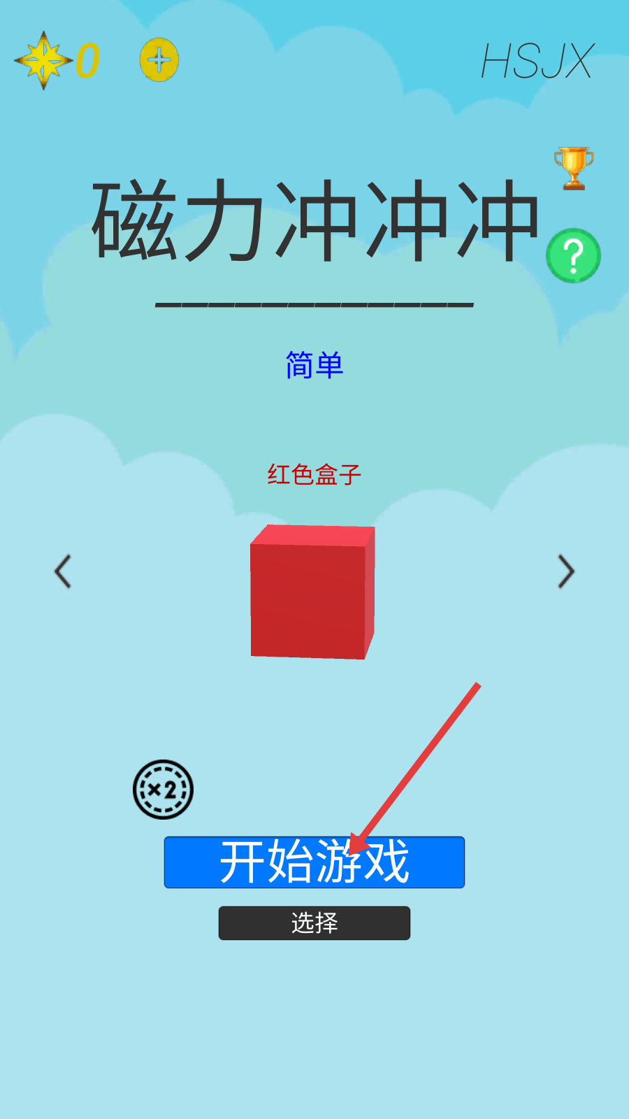 1、进入【磁力冲冲冲】游戏界面,选择【简单-红色盒子】关卡,点击【开始游戏】按钮开启挑战。