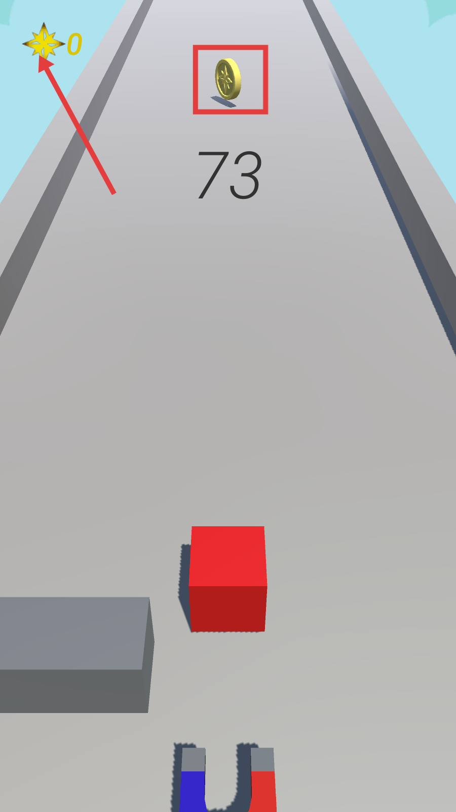 2、挑战中操控红色方块收集【金币】,同时关注左上角星星数量与分数【73】,积累资源推进关卡。