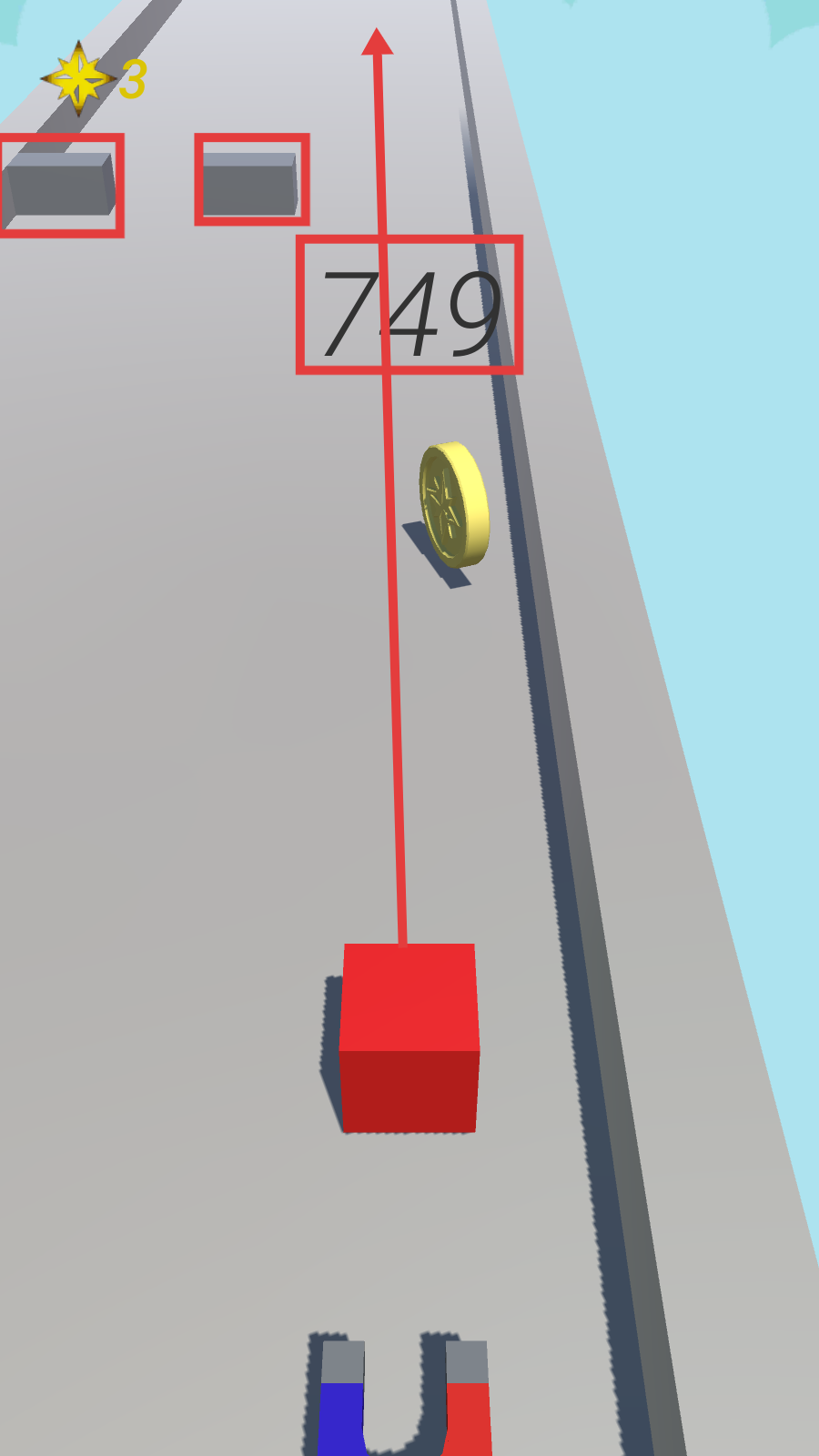 3、继续操控方块收集金币,避开灰色障碍物,分数提升至【749】时星星数量达【3】,高效推进获取更多资源。