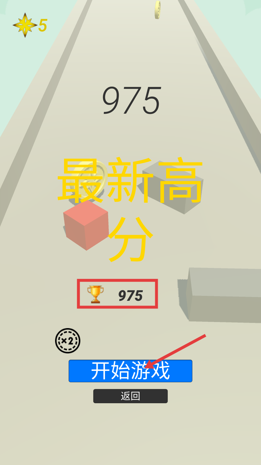 4、挑战结束后界面显示【最新高分-975】,点击【开始游戏】按钮可再次挑战,冲击更高分数记录。