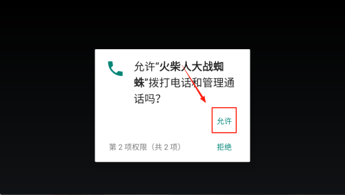 1、授权通话权限:当系统询问“允许火柴人大战蜘蛛拨打电话和管理通话吗?”时,点击“允许”即可继续下一步。