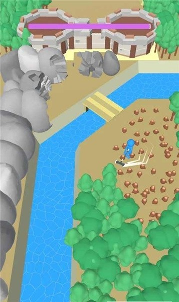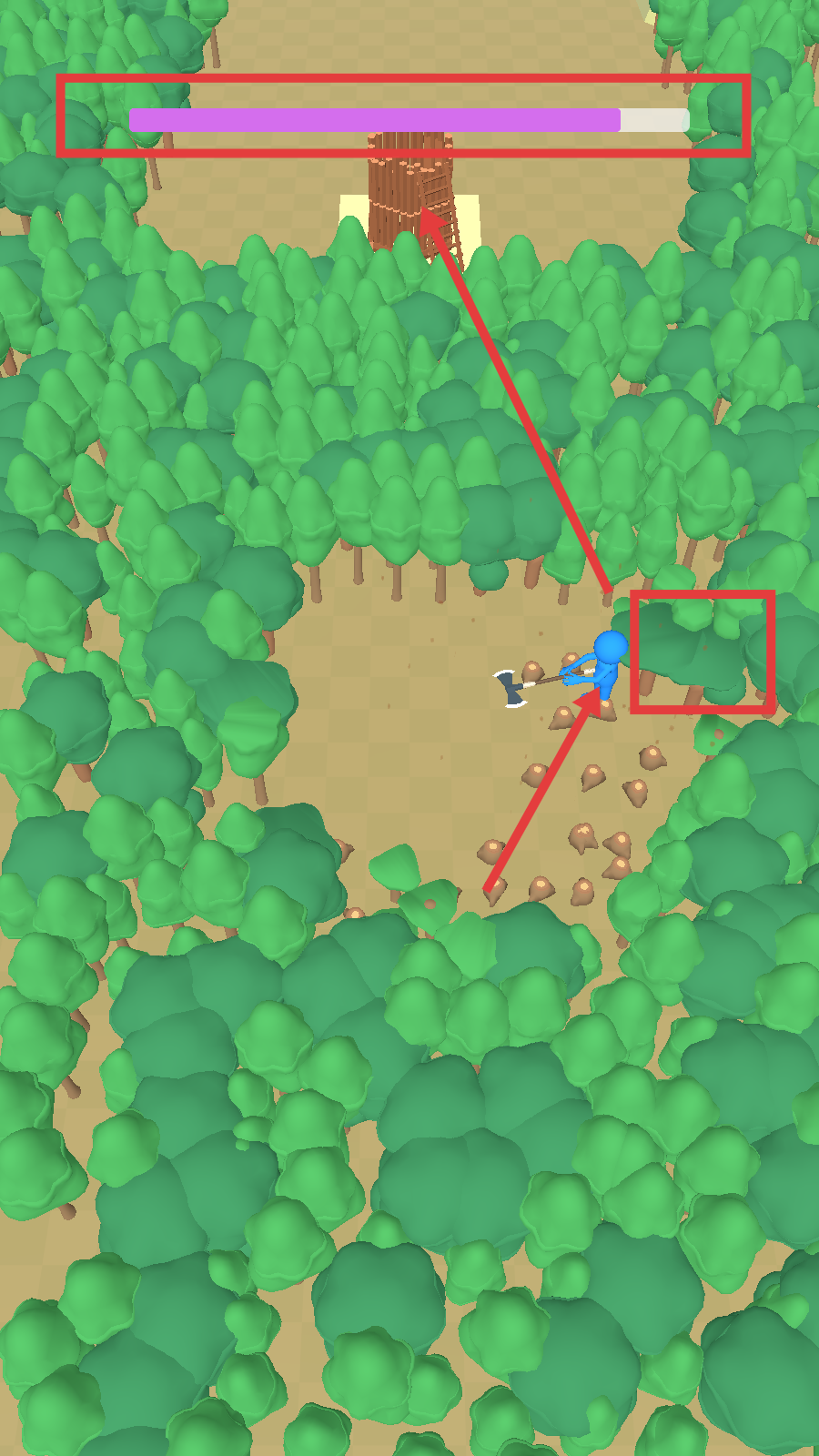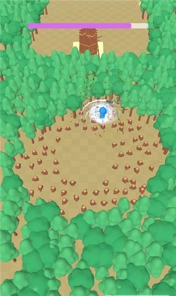 2、操控角色砍伐树木,积累资源同时关注上方进度条,资源足够后可用于后续军队养成与防御建设。