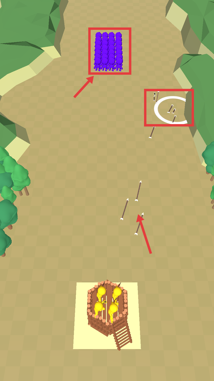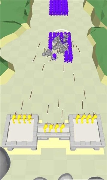 3、指挥黄色小人箭塔释放箭雨击杀紫色小人,白色圆圈是弓箭的攻击范围,操纵白圈往紫色小人队伍中间靠,精准操作可提升战斗胜利效率。