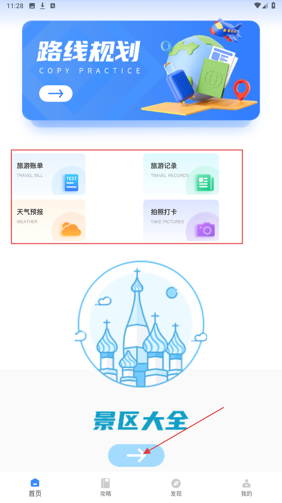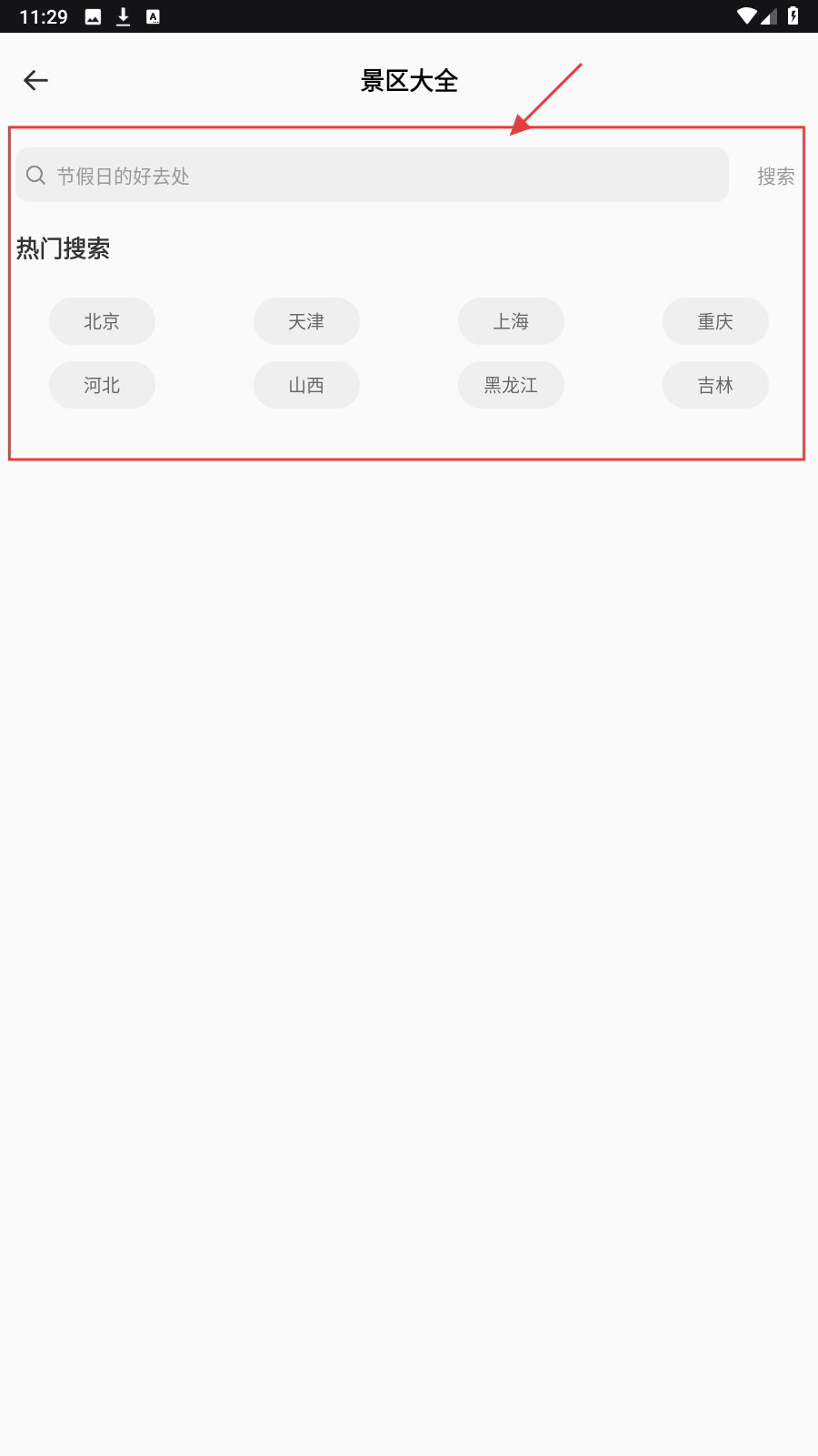 1、打开应用,点击【景区大全】箭头,进入景区搜索页选目的地。