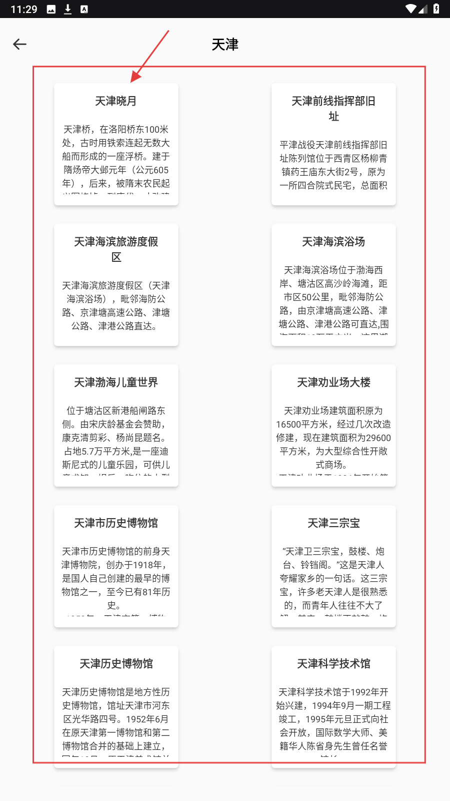 3、选【天津】后,浏览景区列表,点感兴趣的如【天津晓月】了解详情。
