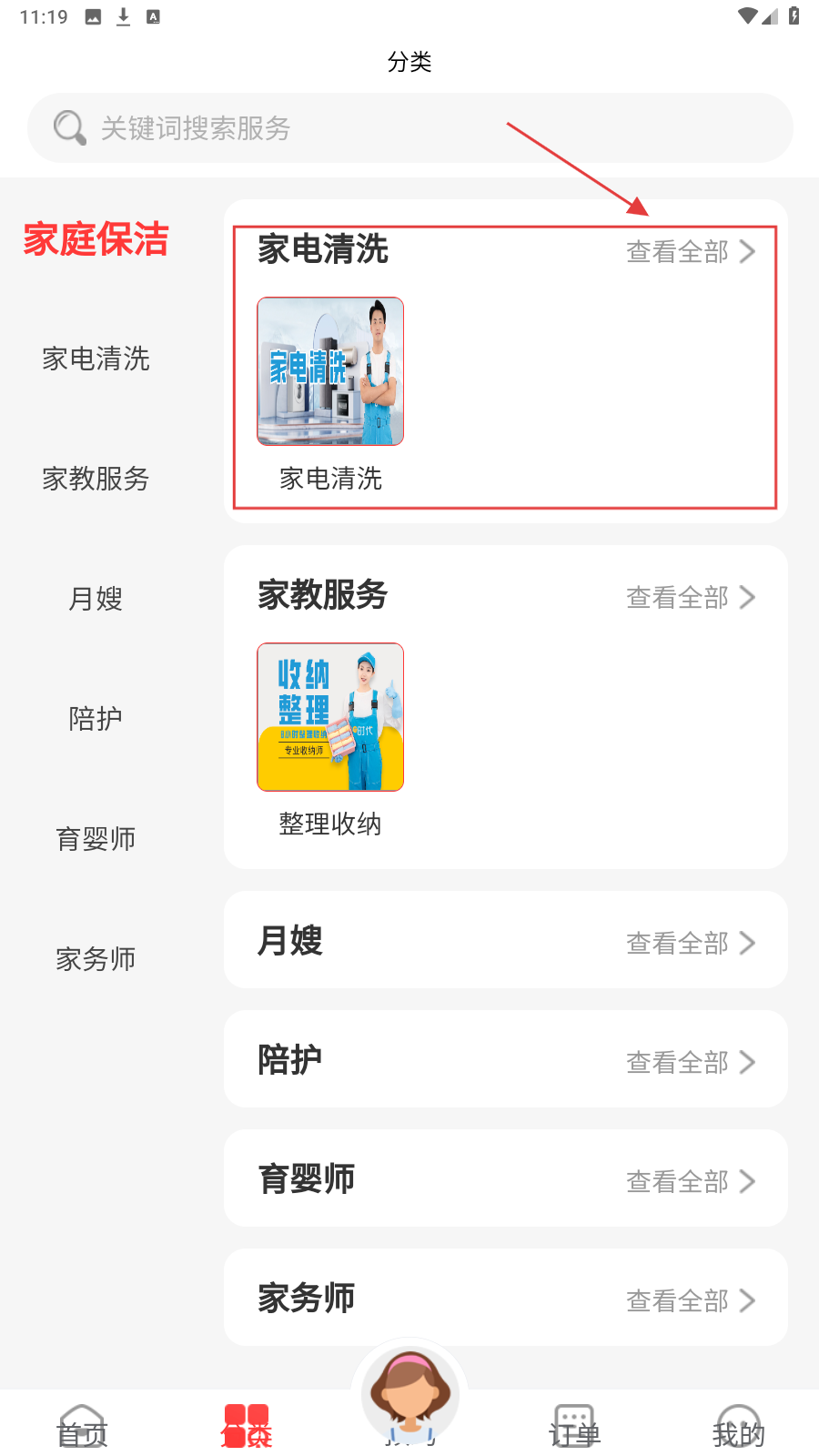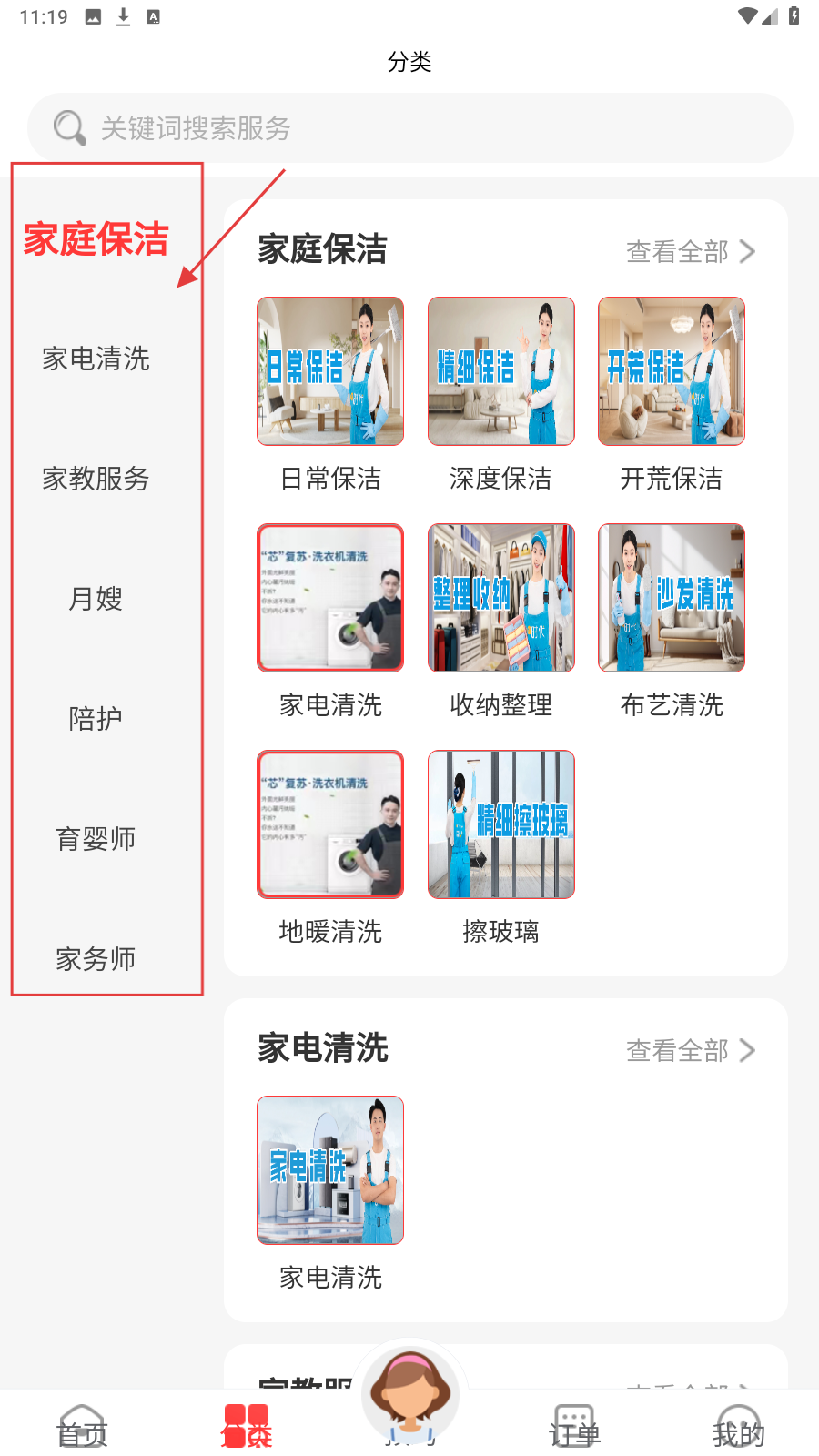 1、在分类页选【家庭保洁】,可查看日常-保洁等细分服务。