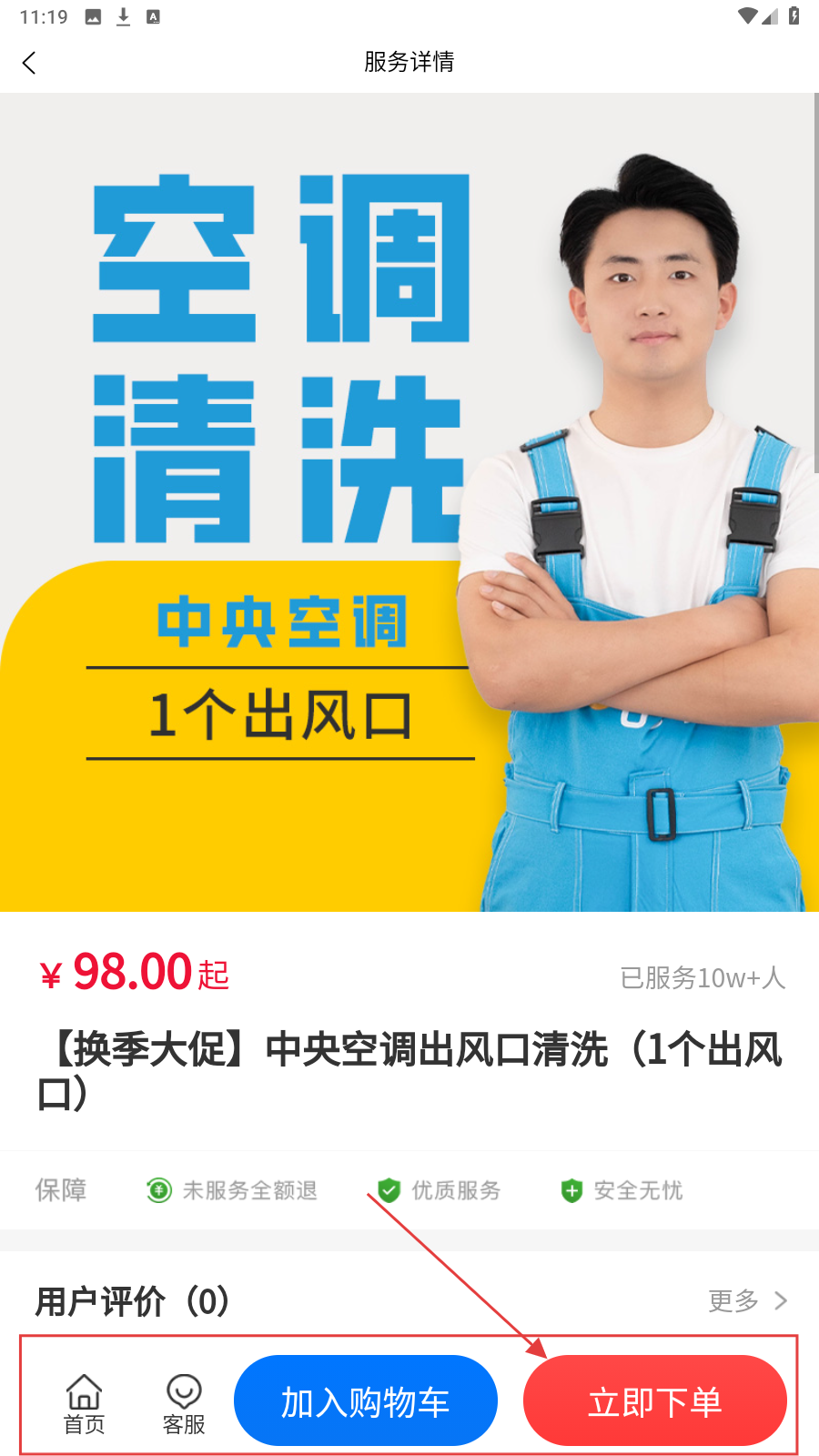 4、确认服务详情后,点【立即下单】完成家电清洗预约。