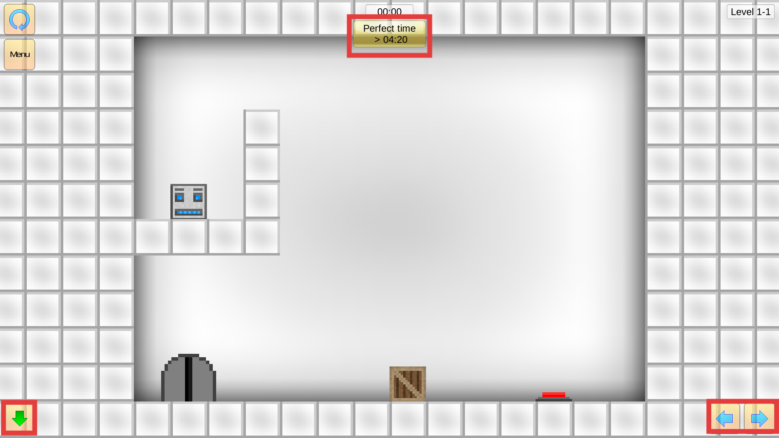 2、进入关卡后,留意【Perfect-time->04:20】时间目标,操控机器人向右侧木箱与红色按钮区域移动。