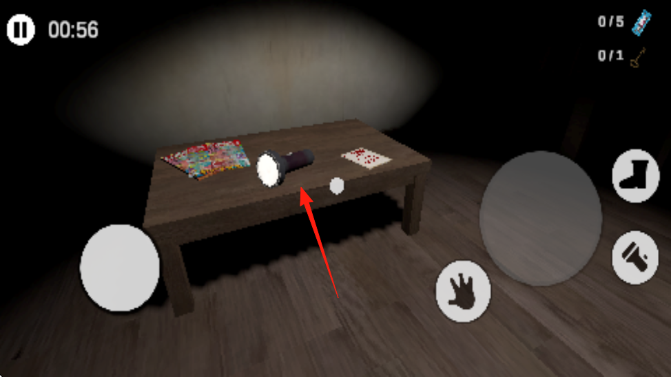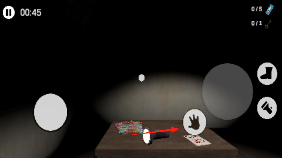 1、进入游戏到黑暗场景中,操控角色,靠近桌子,点击手图标,收集物品手电筒、彩色物件等。