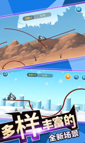 4、通过重力感应操控越野摩托,完成攀爬、飞跃等特技动作挑战赛道记录。