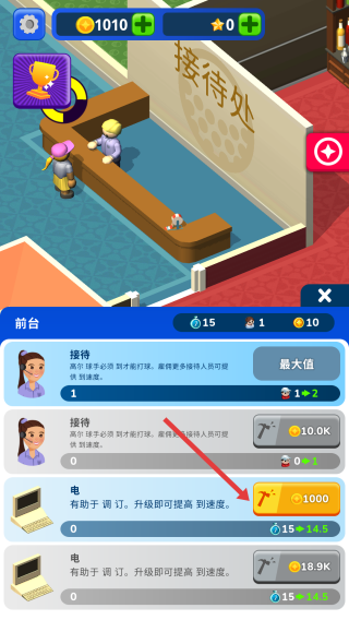 1、游戏开始时,操点击接待处的员工,触发接待处要升级的地方。