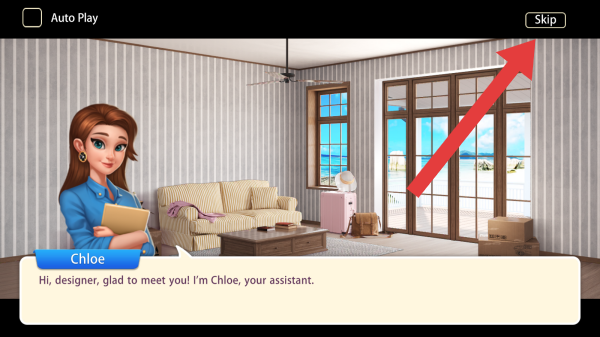 1、画面呈现了室内的场景,与角色进行互动对话交流,可点击Skip跳过次对话框进入下一步。