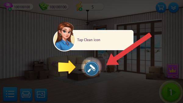 2、玩法规则:需要对室内进行重新翻新,根据提示点击相对应的图标进行操作,属于新手教程的指引。