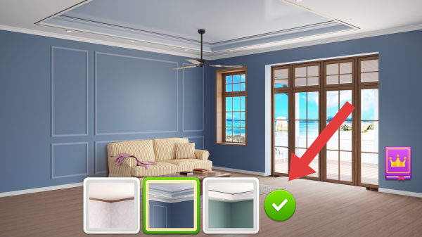 3、第一个重新改造的是墙壁,有三种不同的花色,可根据自身进行选择,选择后点击打钩的图标确认。