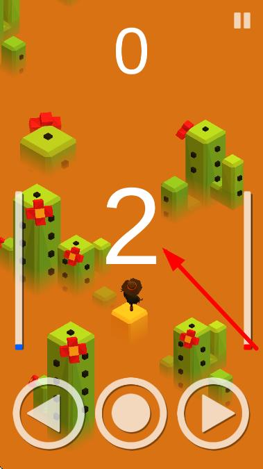2、依据箭头指向数字2的方向,用左右箭头按钮控制角色移动,避开绿色仙人掌,沿路径跳跃黄色方块。