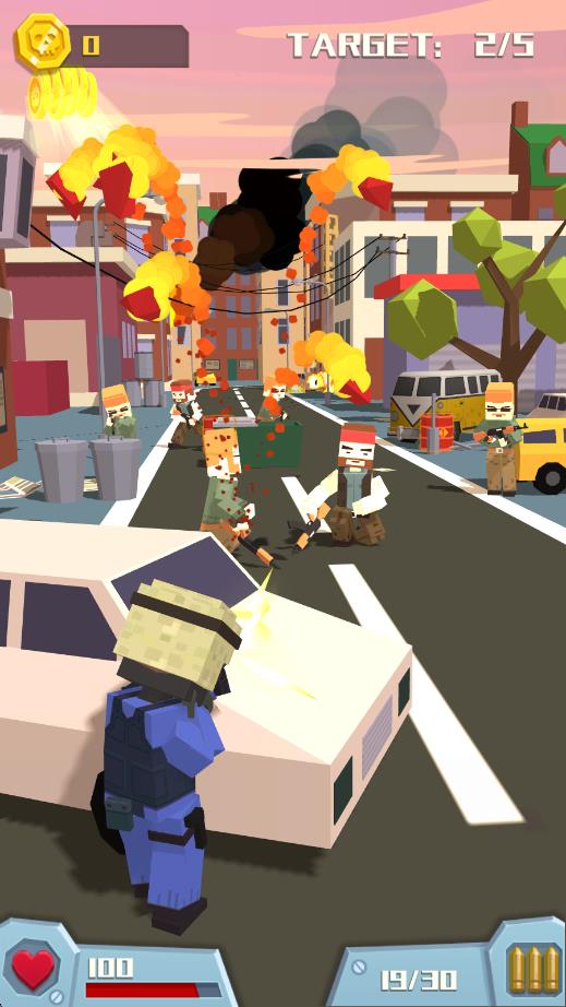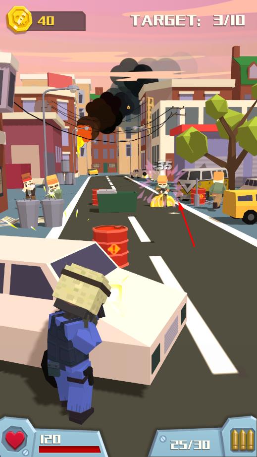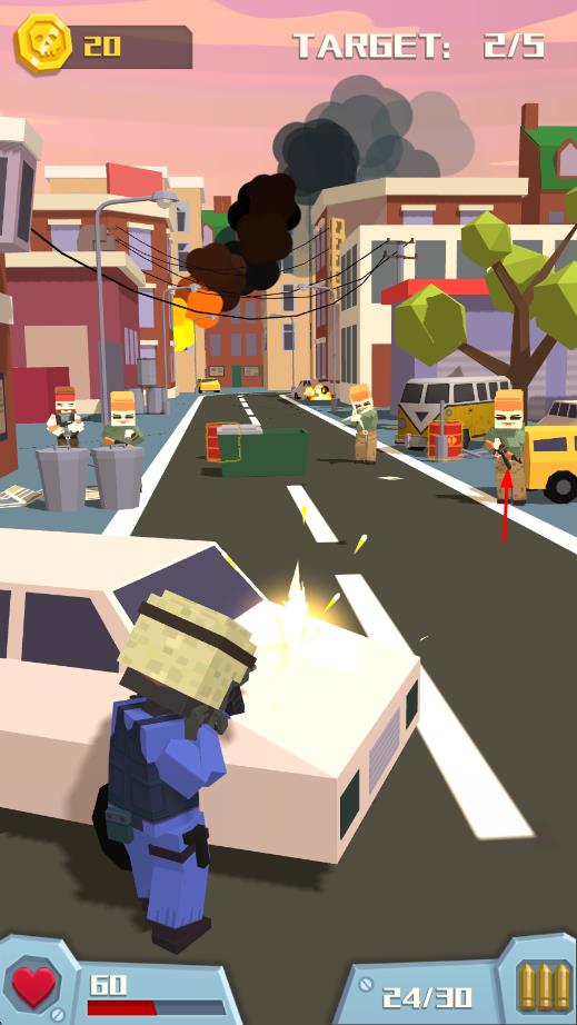 1、进入游戏,滑动屏幕左下角的虚拟摇杆操控方块特种兵移动,在城市街区穿梭,熟悉周边环境,寻找有利地形与初始武器。