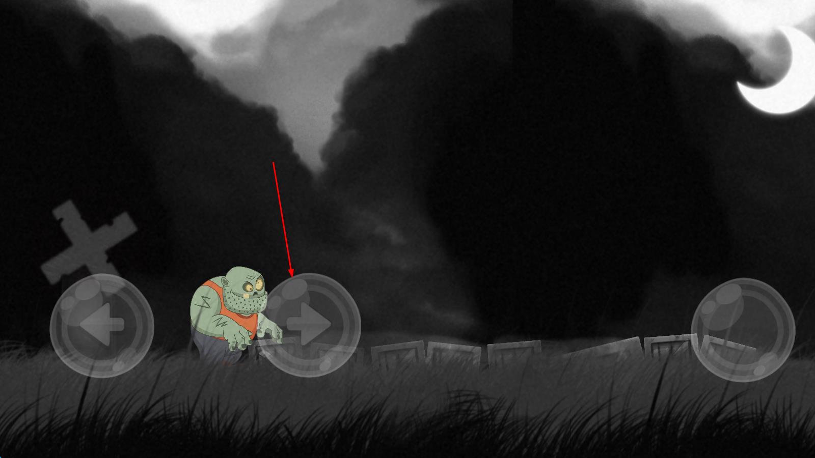 1、进入可怕的死尸之夜,置身于恐怖的夜晚场景,熟悉屏幕左侧的左右移动按钮与右侧的跳转按钮,为躲避危险做好准备。