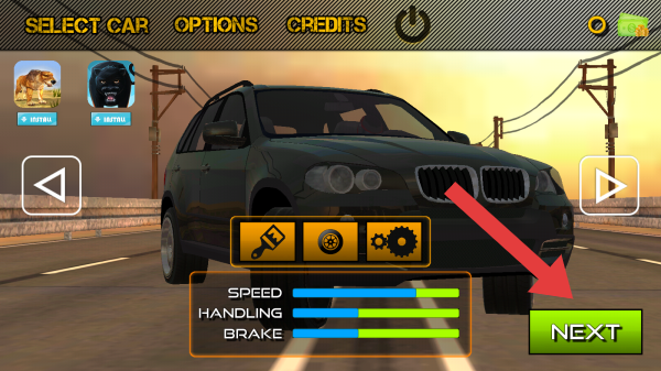 1、画面呈现了选车的页面,玩家需要根据提示进行选择自己喜欢的车辆,选择后可点击NEXT进入到下一个场景。