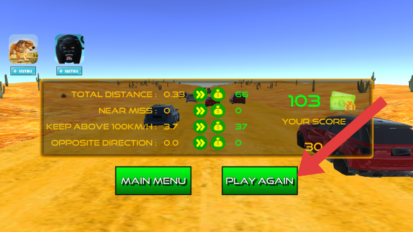 3、呈现赛后结算的页面,获得了奖励金币+103,玩家可以通关比赛来获取,点击PLAYAGIN进行下一场。