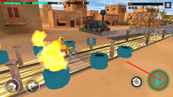 1、开始在撒哈拉沙漠的关卡,点击右侧绿色加速键起步,用左右箭头控制摩托的转向,避开对面的障碍。