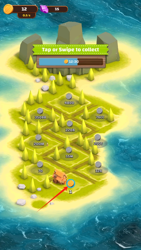 1、在岛屿经营游戏界面,点击或滑动,积极收集金币,完成20个的收集目标。