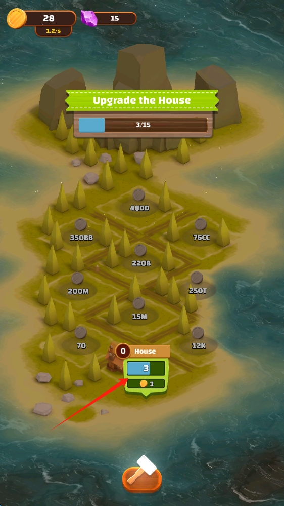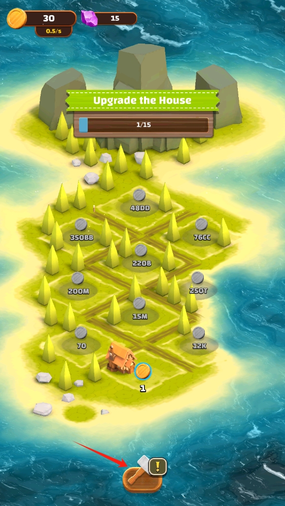 3、消耗资源,点击升级按钮,提升房屋等级,增强岛屿经营能力,推进游戏进程。