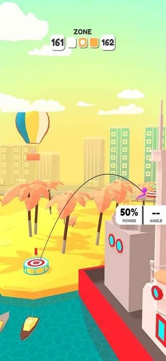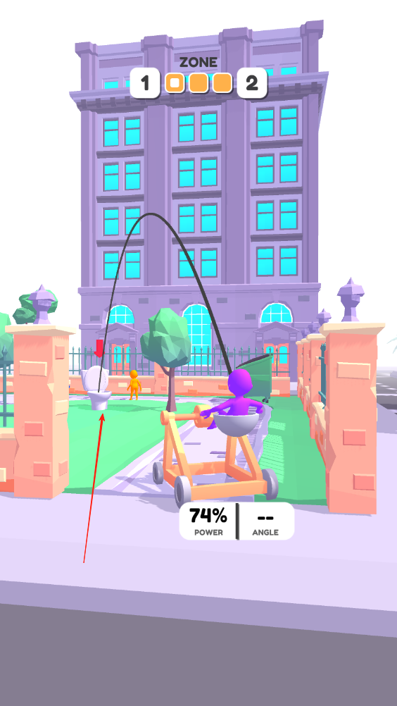 1、观察小人位置与厕所的路线,往后拖动屏幕,空中会出现一条弧线,只要落点在马桶上即可。