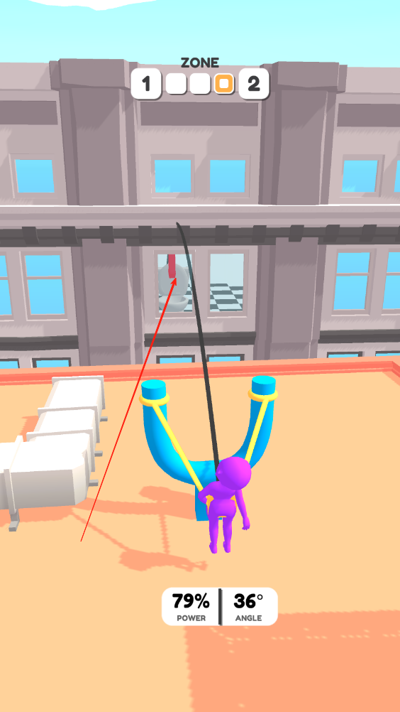 2、这一关卡马桶在楼里,我们需要让落点在马桶后面一点,因为玻璃会阻挡一点力,让小人落下马桶前面。