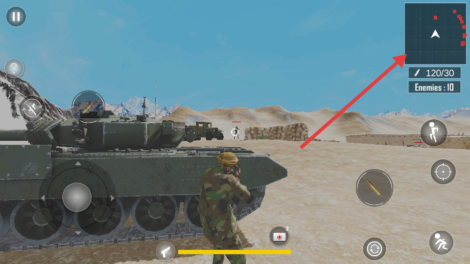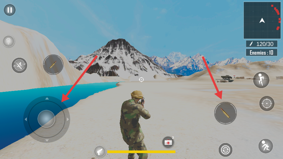 1、通过虚拟摇杆控制角色移动,滑动屏幕调整射击视角。
