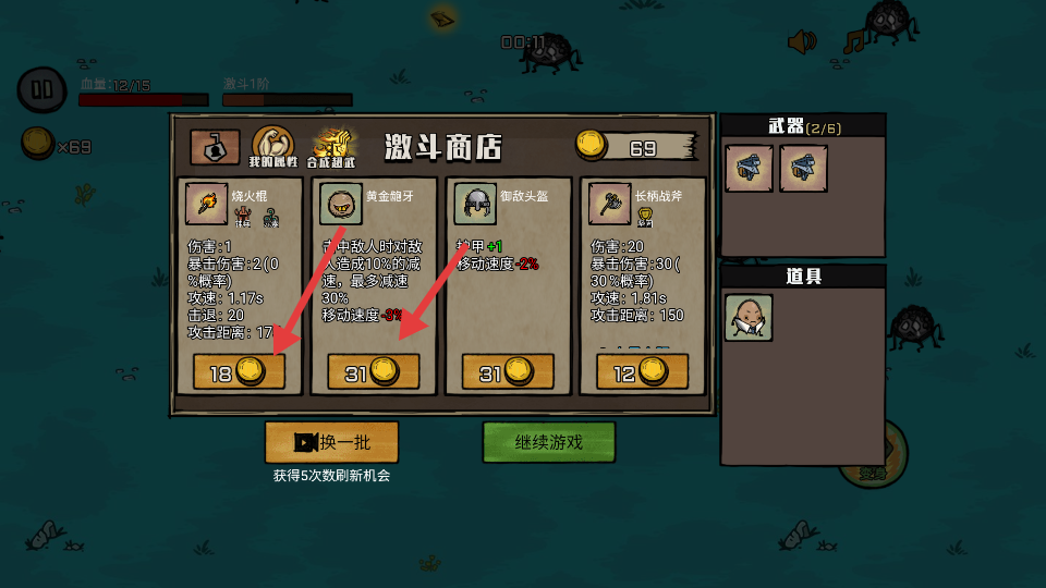 3、每关结算用金币购买永久道具,叠加暴击吸血等连锁效果。