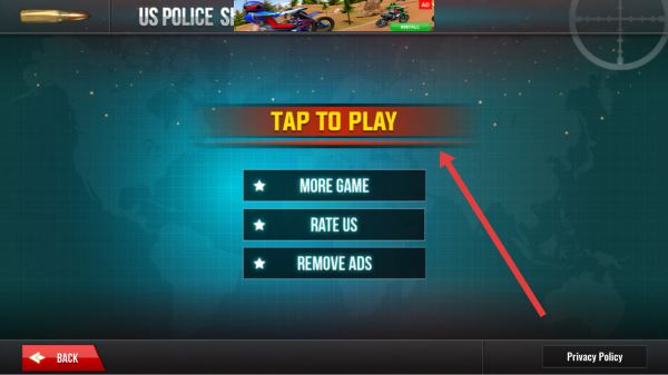 1、在US-POLICE-SHOOTER游戏主界面,点击醒目的TAP-TO-PLAY按钮,进入关卡选择页面,准备开启射击任务之旅。