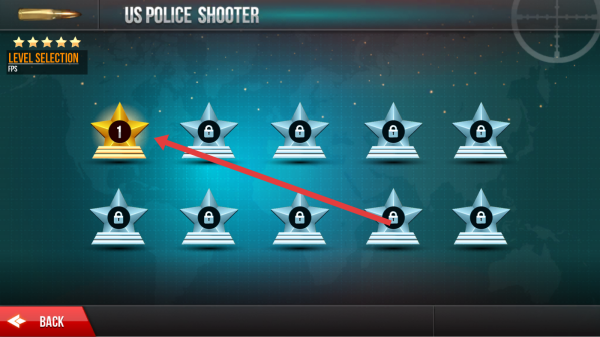 2、关卡选择界面中,点击已解锁的金色星星标识的LEVEL-1,进入游戏第一关,投身警察射击任务的初始挑战。