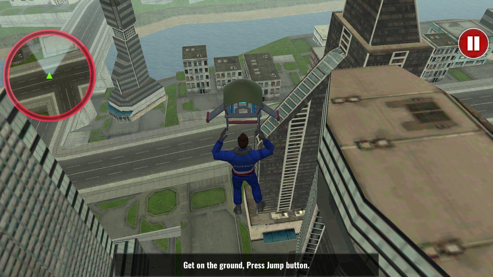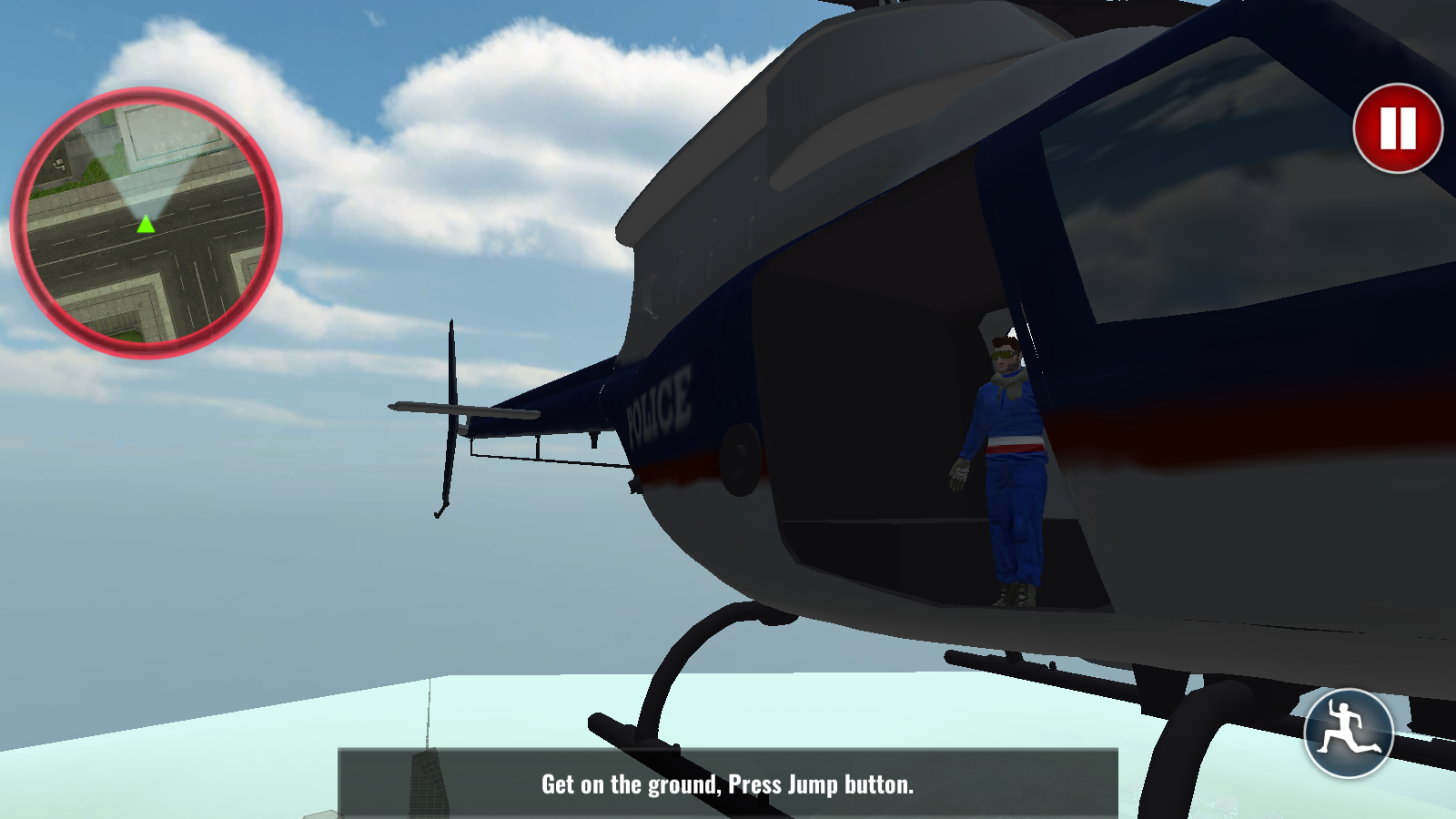 3、进入关卡后,角色位于直升机内,按提示点击右下角跳跃按钮,操控角色从直升机跳下,朝着目标区域进发,开启任务执行。