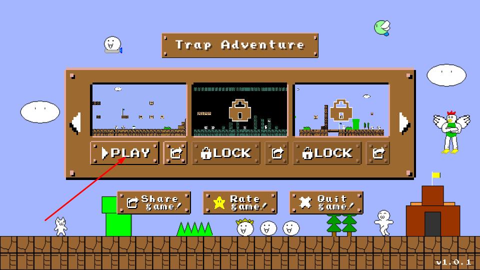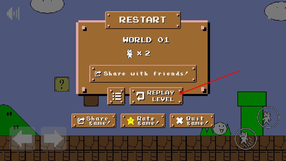 2、通过左侧箭头按钮控制移动方向,右侧按键触发跳跃,需警惕场景隐藏陷阱如问号砖块下的尖刺、敌人白色圆球、猫形怪,规划行动躲避伤害。