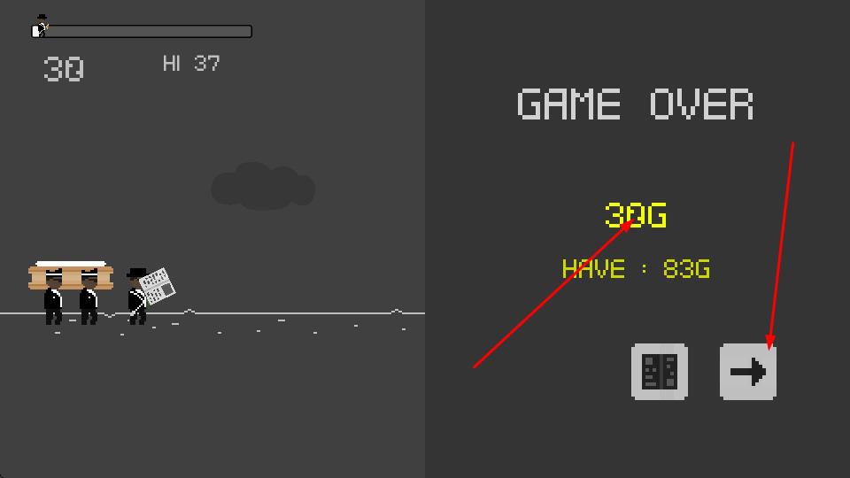 3、若触碰尖刺/敌人,触发GAME OVER,右侧显示当前分数30G、持有金币83G,点击箭头按钮,重新挑战关卡。