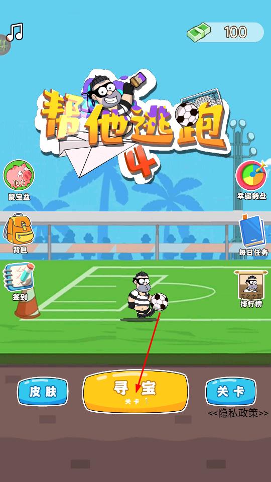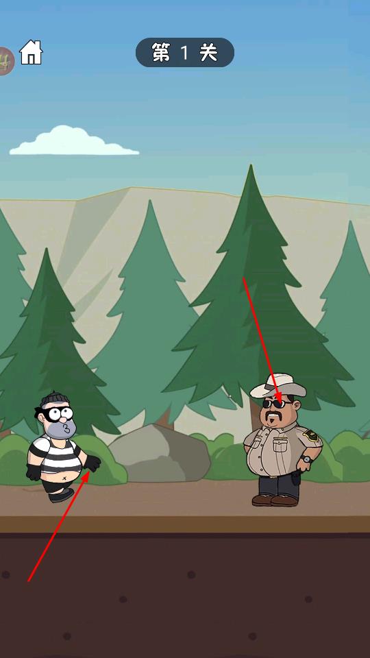 1、主界面点击黄色寻宝关卡1按钮,进入第1关,场景为森林,操控条纹囚犯角色,面对戴帽警察,需规划行动躲避追捕。