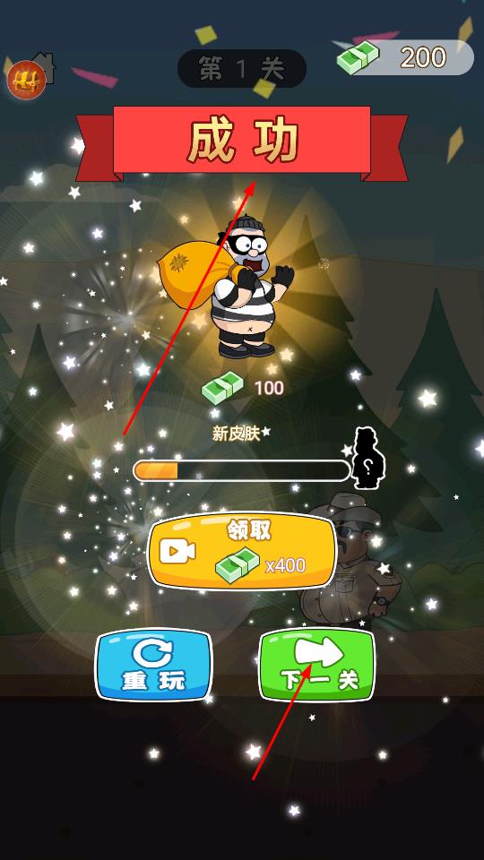 3、成功逃脱后,界面弹出成功提示,获得金钱如100→200、新皮肤奖励,点击绿色下一关推进关卡,或选重玩重复挑战当前关。