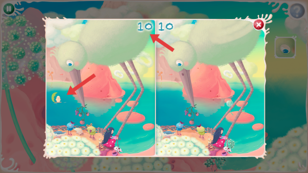 3、需要观察左右两个画面,找出河水上白色的生物及细节其他的十个差异,完成找茬解谜解锁新内容。