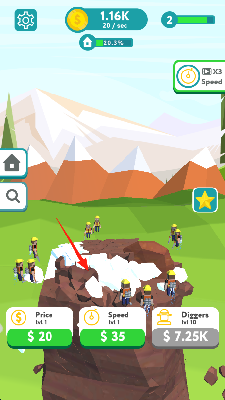 1、雇佣矿工戴黄帽角色,点击岩石,消耗金币20、35升级Price收益,Speed速度,提升挖掘效率。