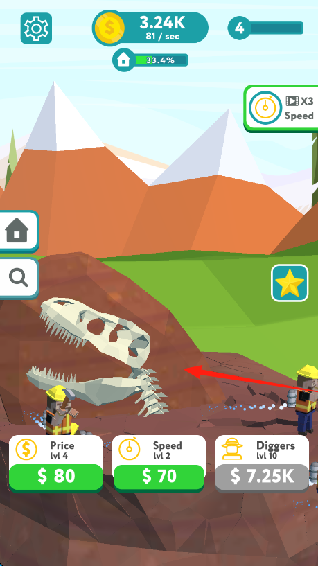 3、深入挖掘,解锁恐龙化石等特殊物品,拓展矿山内容,通过升级矿工与属性,持续推进挖掘,获取更多资源。